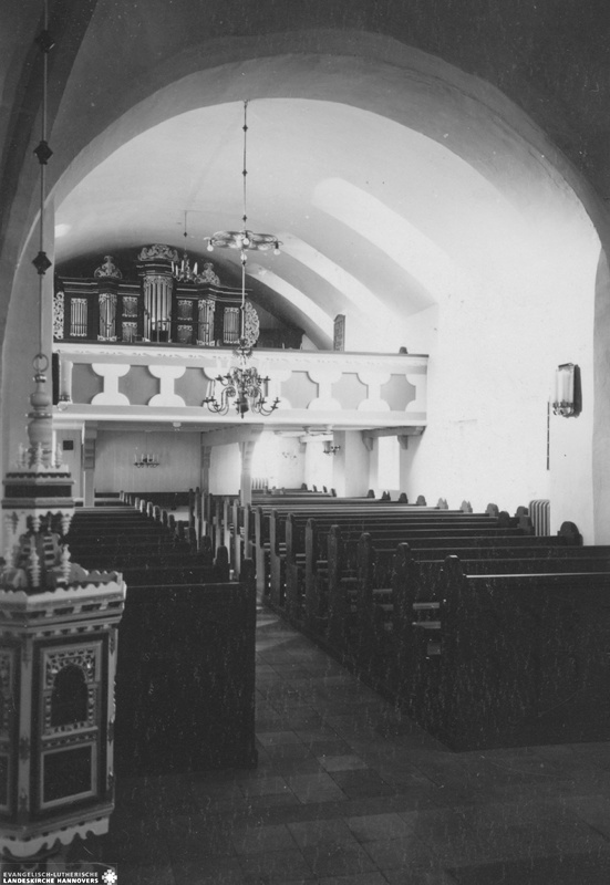 Steyerberg, Katharinen-Kirche, Innenansicht nach Westen, April 1956