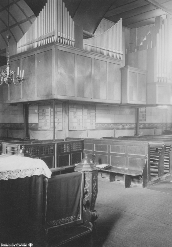 Warmsen, Georgs-Kirche, Innenansicht nach Südwesten mit Orgel, Mai 1956